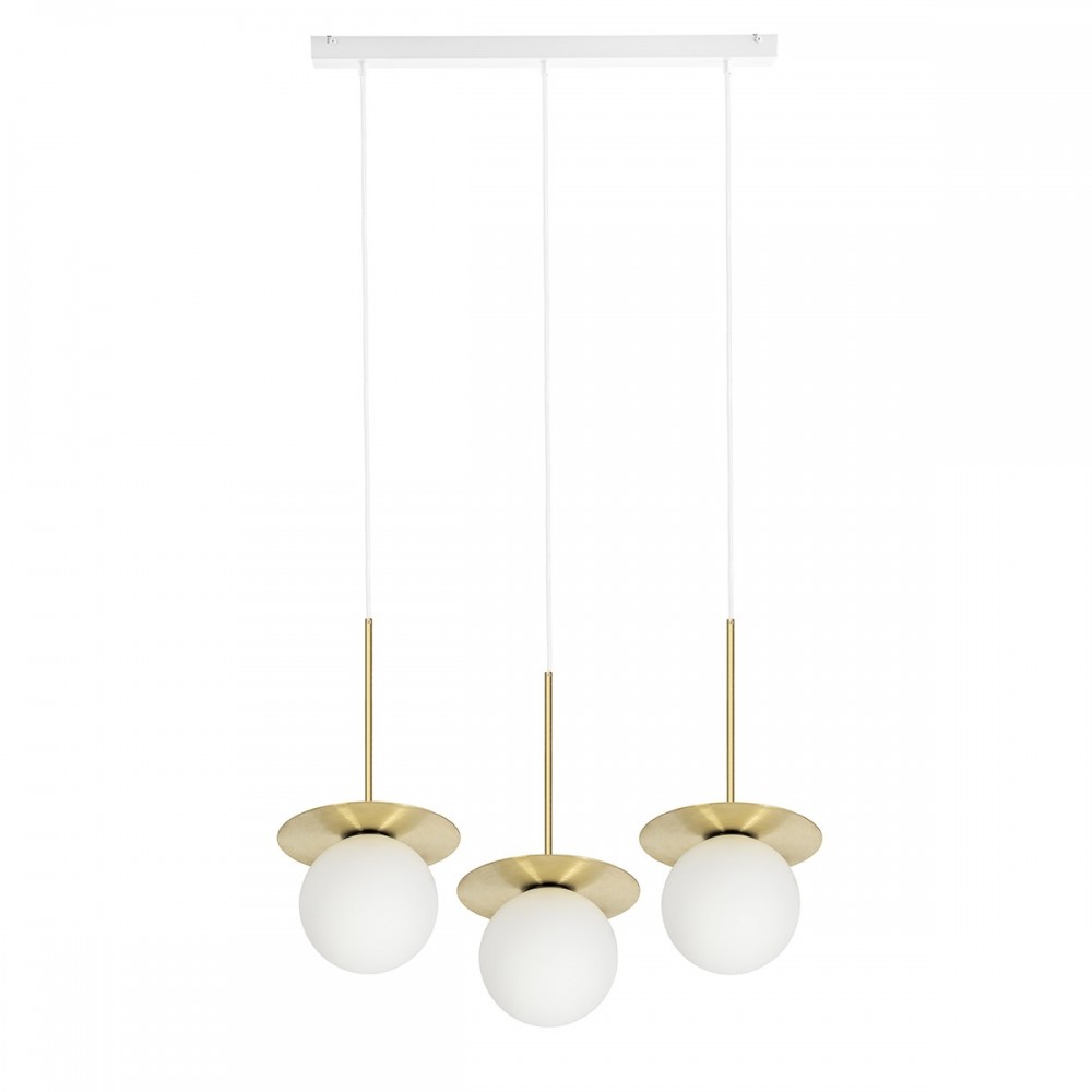 • triple pendant lamp on a strip • brushed brass, white (Signal White RAL 9003) • material: brass, metal, glass • length 60cm • width 20cm • height 43cm • total length 130cm • 3x milky white glass shade ⌀15cm • white strip 60cm • 3x brass disc ⌀20cm • 3x white polyester braided cable • G9 thread • max 3x12W LED • IP20