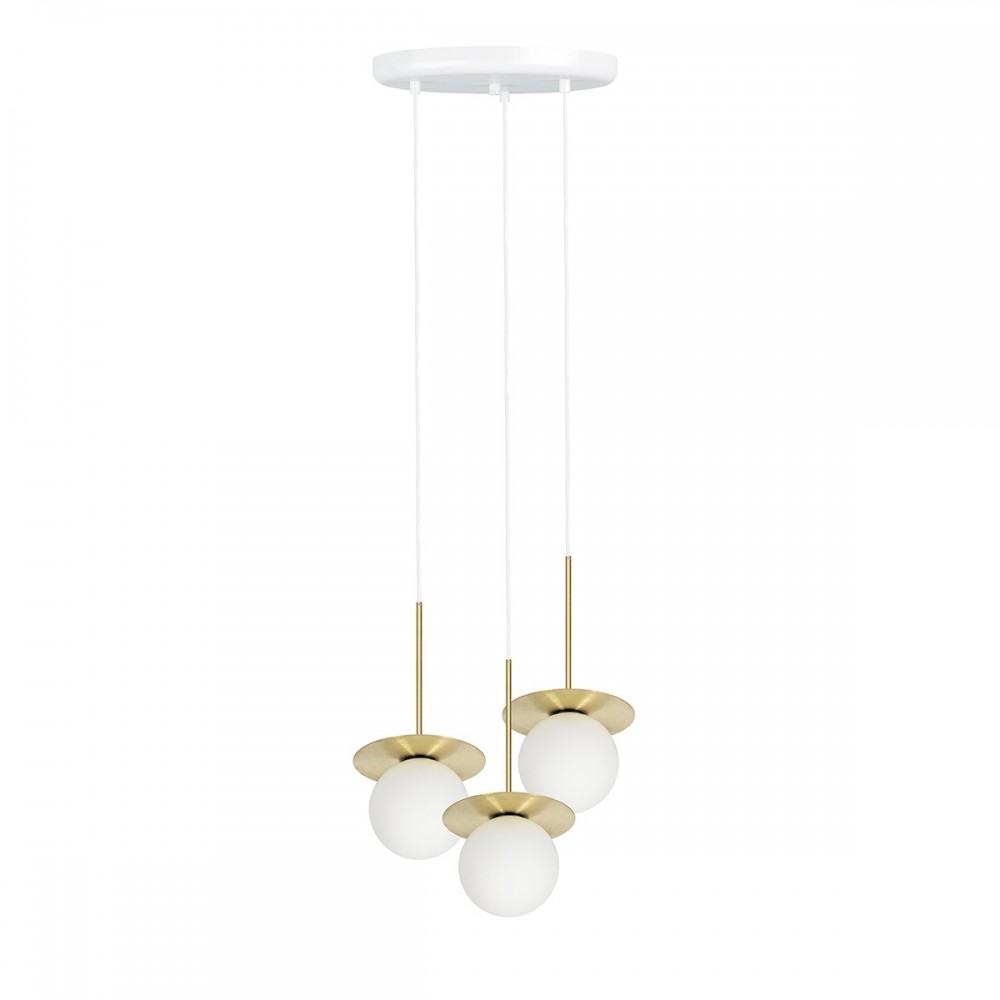 • triple pendant lamp on a ceiling • brushed brass, white (Signal White RAL 9003) • material: brass, metal, glass • length 30cm • width 30cm • height 43cm • total length 160cm • 3x milky white glass shade ⌀15cm • white ceiling cover ⌀30cm • 3x brass disc ⌀20cm • 3x white polyester braided cable • G9 thread • max 3x12W LED • IP20