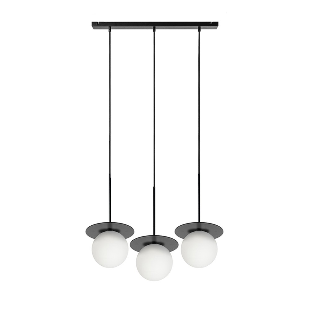 • triple hanging lamp on a strip • black (Jet Black RAL 9005) • material: metal, glass • length: 60cm • width: 20cm • height: 43cm • total length: 130cm • 3x milky white glass shades ⌀15cm • black strip 60cm • 3x discs ⌀20cm • 3x black polyester braided cable • G9 thread • max 3x12W LED • IP20