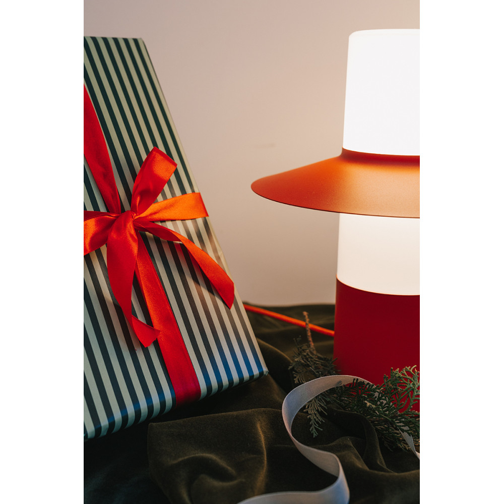 The metal lampshade with a soft, rounded form comes in the colors: red-orange RAL 2002, black RAL 9005, white RAL 9003, olive RAL 6013, blue RAL 5014. It is set on a slender, minimalist metal base.