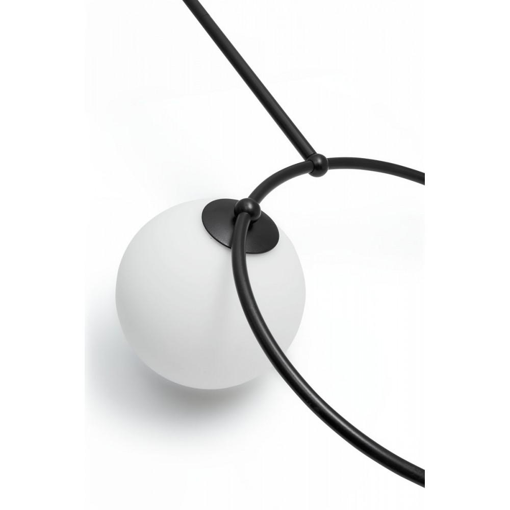 • ceiling lamp, pendant lamp • black (Jet Black RAL 9005) • material: metal, glass • length: 35.2 cm • width: 31.6 cm • height: 66 cm • total length: 150 cm • 2x milky white glass lampshades ⌀15 cm • black ceiling canopy ⌀12 cm • black frame ⌀32 cm • black polyester braided cable • G9 thread • max. 2x12 W LED • IP20
