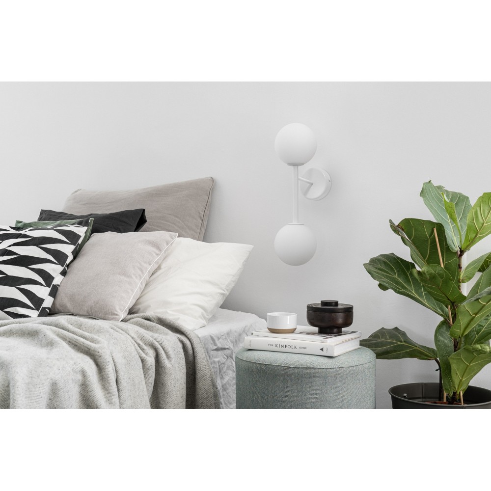 Kop B is an elegant wall sconce that develops the idea of the Kop A model - this time with two milky white spherical lampshades with a diameter of 15 cm. Their arrangement on either side of the vertical metal tube creates a balanced but dynamic light composition, reminiscent of an arrangement of planets in motion. The lamp attracts attention with subtlety of form and graphic lightness, perfectly fitting into modern, minimalist and timeless interiors.