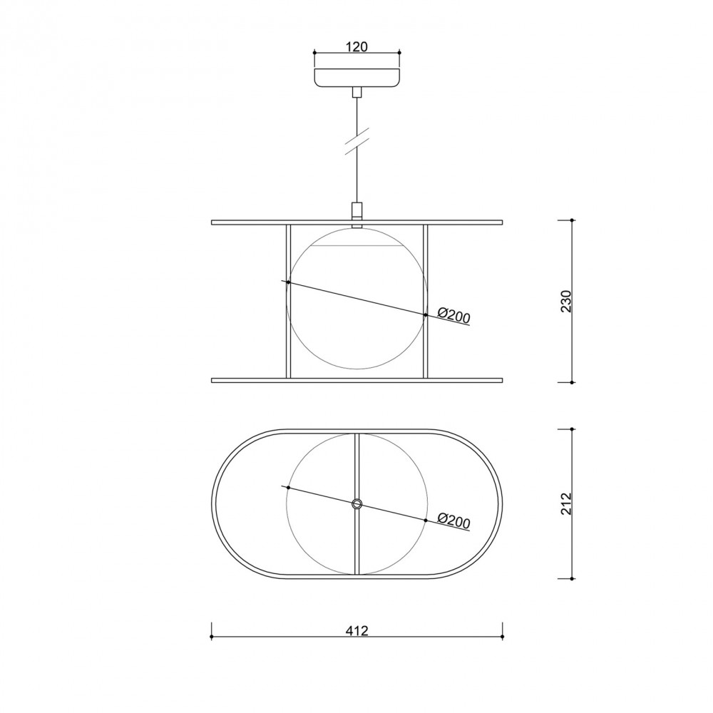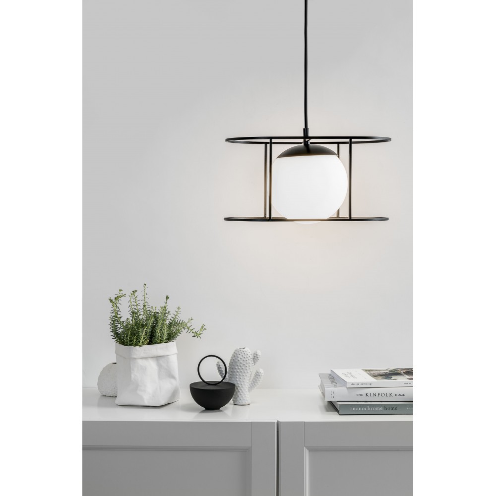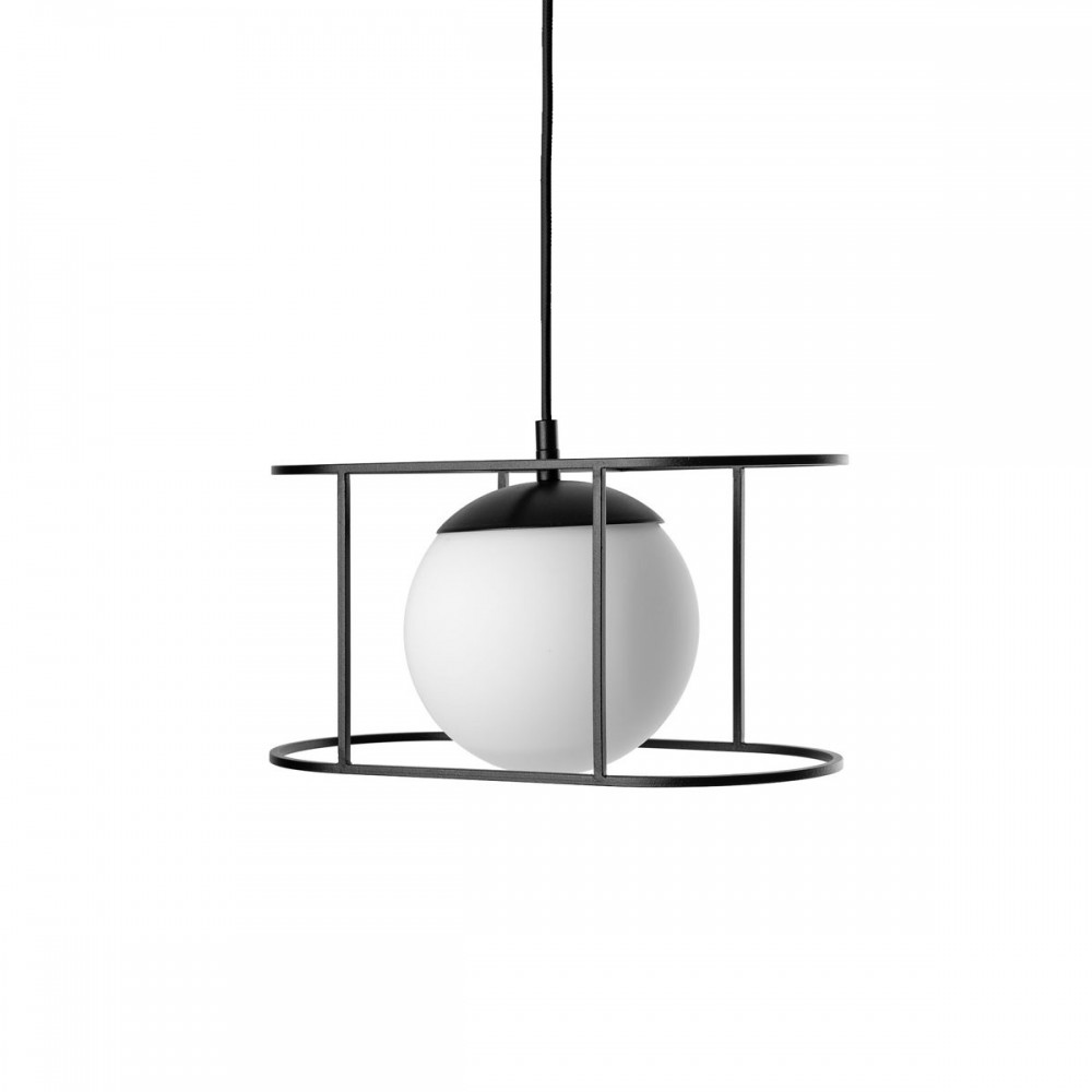 • ceiling lamp, pendant lamp • length 123 cm • glass shade in white matt • metal frame and ceiling mask in black structural • black cotton braid • two-core cable 2 X 0.75mm2 • max. 15W • IP44