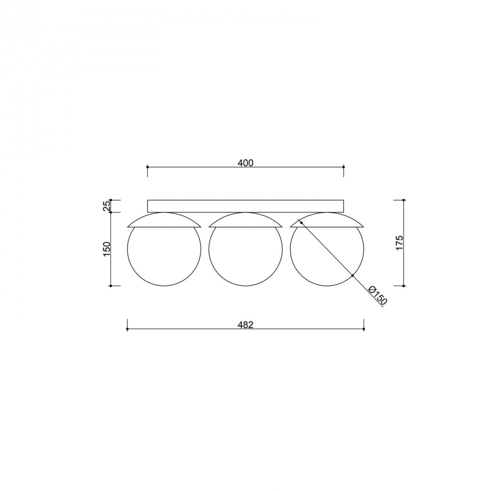 • ceiling lamp, plafond • black (Jet Black RAL 9005) • material metal, glass • length 48.2cm • width 15cm • height 17.5cm • three milky white glass lampshades ⌀15cm • mounting painted in black structural color • G9 thread • max 3x12W LED • IP20