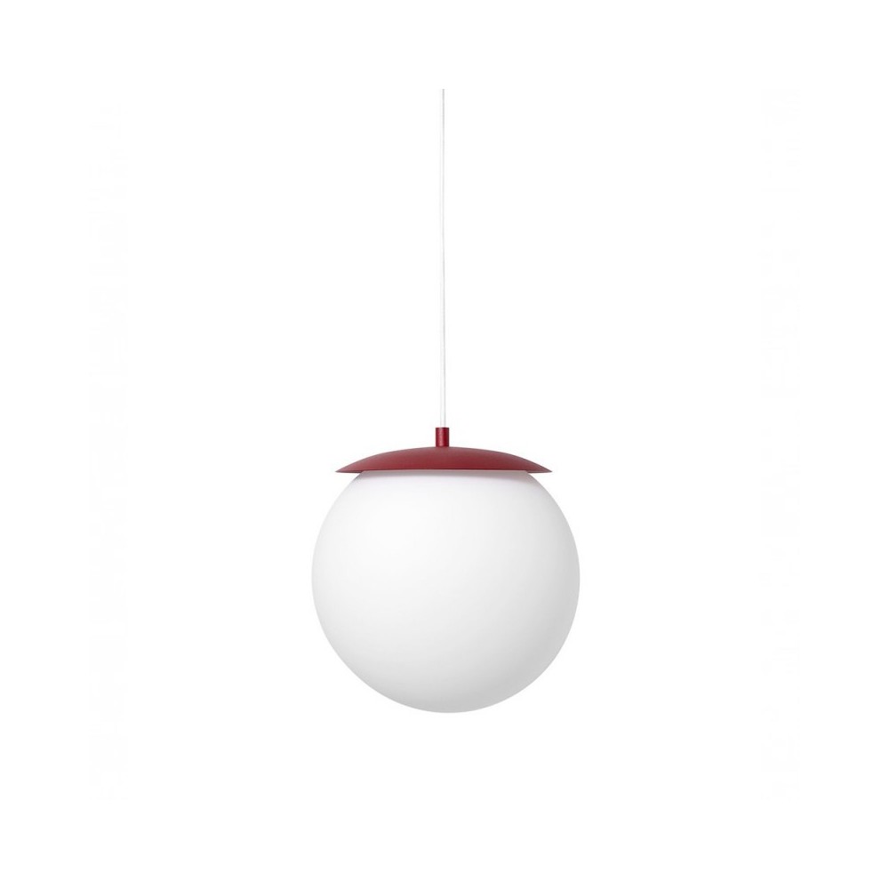 • ceiling lamp, pendant lamp • burgundy color (Purple Red RAL 3004) • material: metal, glass • length: 30cm • width: 30cm • height: 30cm • total length: 130cm • milky white glass shade ⌀30cm • mounting painted in structural burgundy • white polyester braided cable 97.5cm • E27 thread • max 15W LED • IP20