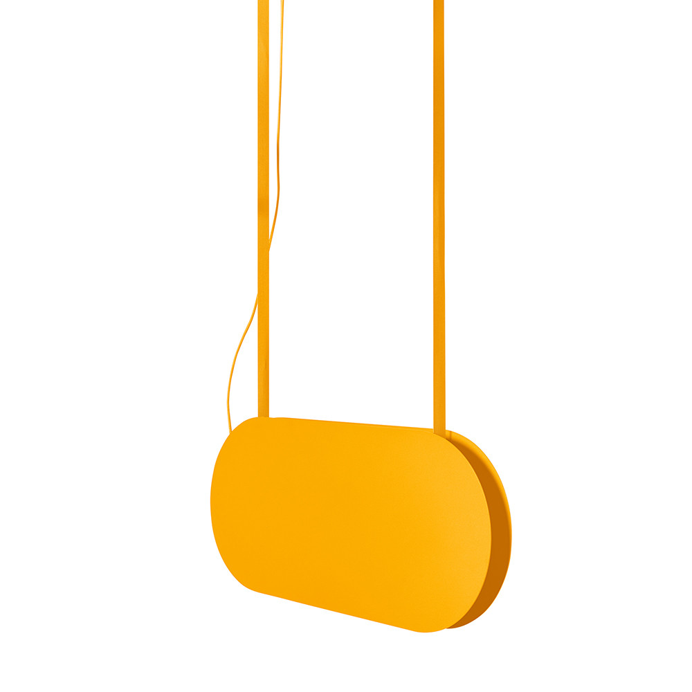 The lamp is suspended from a textile strip in a color matching the body, with a length of 145 cm. Its horizontal form and proportions (80 x 5.2 x 35 cm) make it perfect over a kitchen island, bar or table, bringing not only light, but also character to the space.