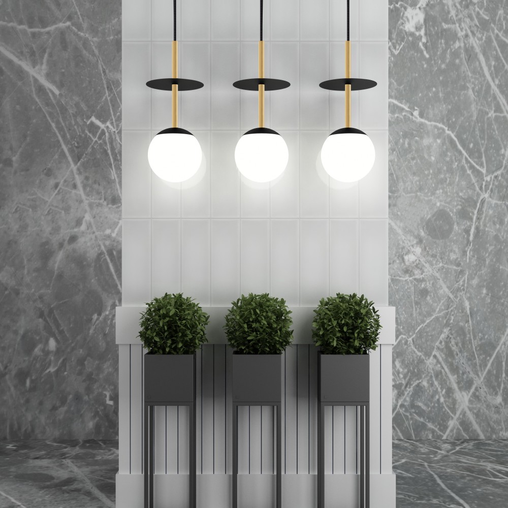 • hanging ceiling lamp • length 160cm • cable length 110cm • glass lampshade in matt white fi 20cm • textured black painted ceiling fi 12cm • metal disc fi 20cm • brass tubes • max 15W • E27 thread