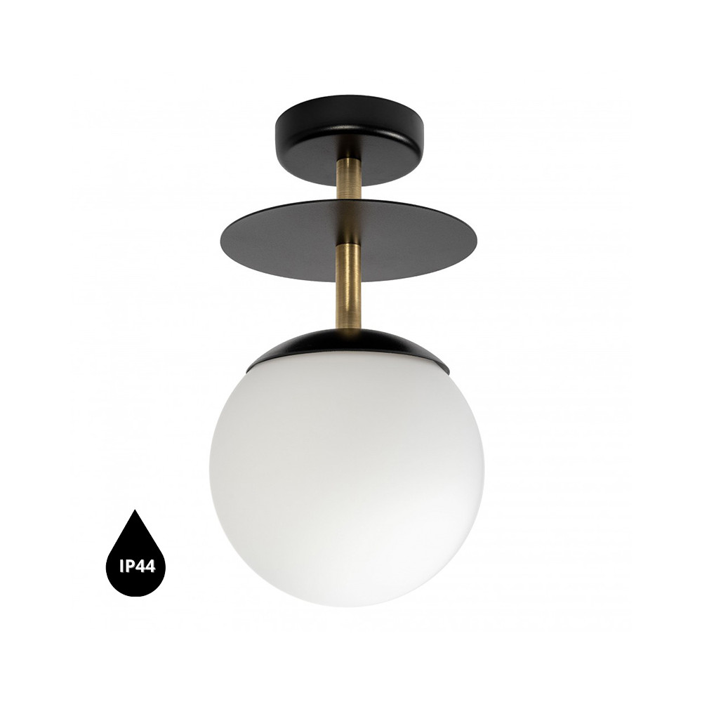• ceiling lamp, plafond • metal / brass / glass • black / brass / white • height 37cm • diameter 20cm • glass lampshade in white matt, dia.20cm • ceiling cover painted in structural black color dia.12cm • metal ring dia.20cm • two-core cable 2 X 0.75mm2 • E27 thread • max. 15W • IP44