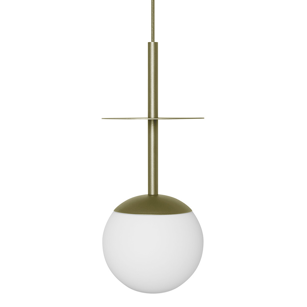 • ceiling lamp, pendant lamp • material: metal, glass • colour: olive (Reed Green RAL 6013) • length: 160 cm • cable length: 110 cm • matt white glass shade, diameter: 20 cm • painted ceiling cover in structural olive colour, diameter: 12 cm • metal disc, diameter: 20 cm • two-core cable 2 X 0.75 mm2 in polyester olive braid • E27 thread • max. 15 W • IP20
