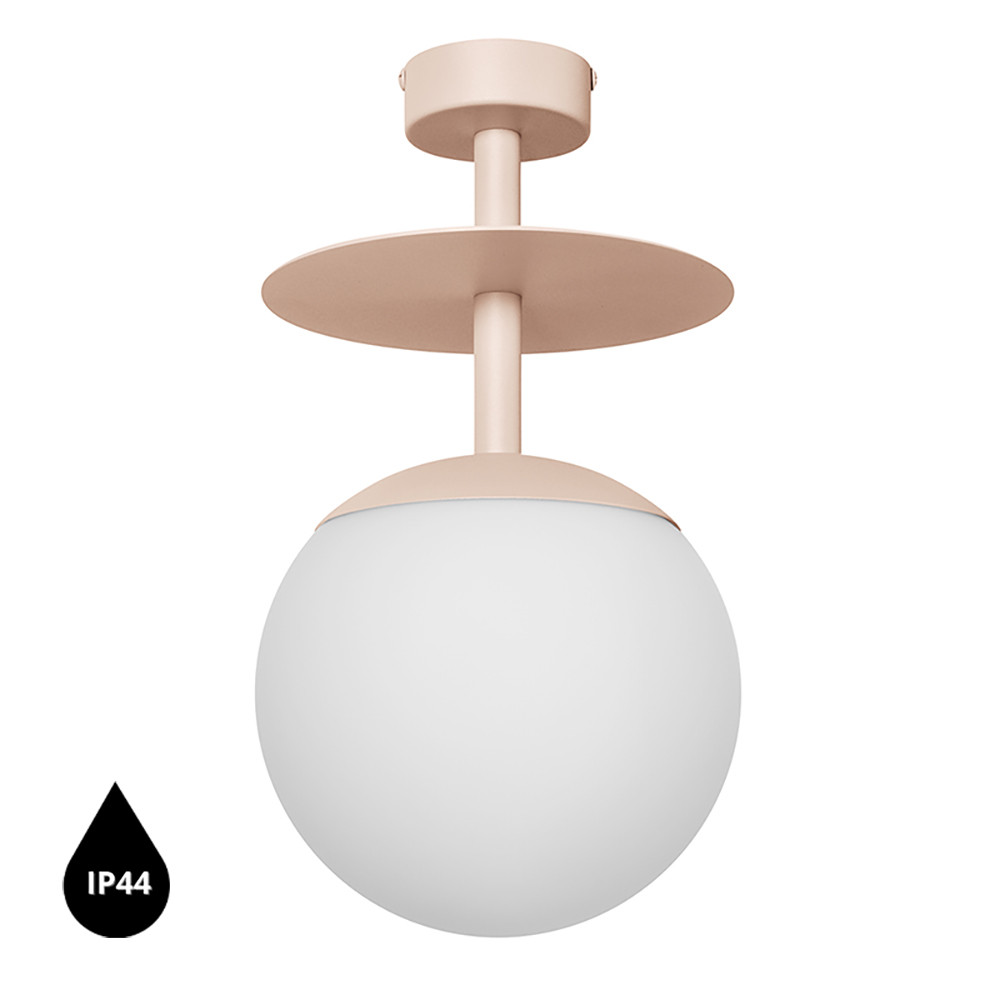 • ceiling lamp • material: metal, glass • colour: beige (Soft Peach) • height: 37cm • diameter: 20cm • glass lampshade in matt white, diameter: 20cm • ceiling cover painted in structural beige, diameter: 8cm • metal disc, diameter: 20cm • two-core cable 2 X 0.75mm2 • thread: E27 • max. 15W • IP44