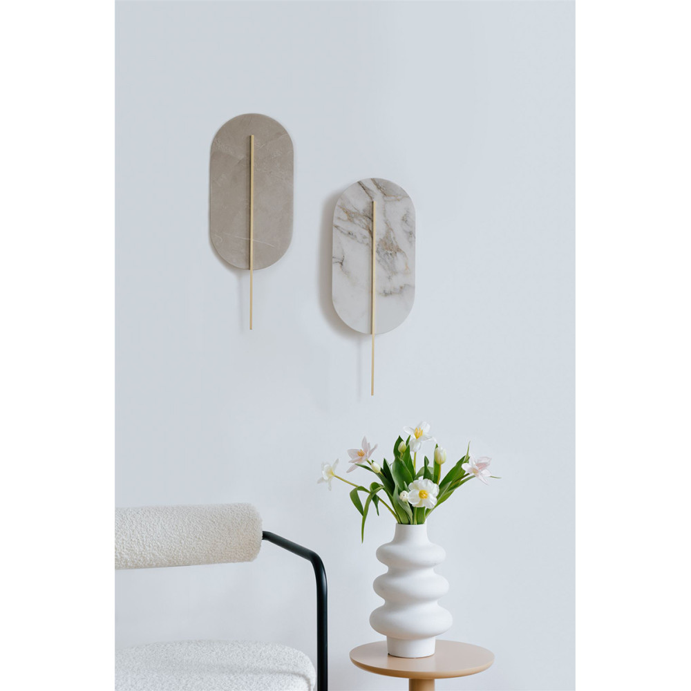 • wall lamp, sconce • beige stoneware color (Ritual Taupe) • rod color to choose from: white, black, melon, brass • manufacturing material metal, brass, glazed stoneware • length 3.8cm • width 21cm • height 56.6cm • lampshade with brass element (attached with magnets to the wall cover) • white metal cover 8x8cm • thread 2xG9 • max 2x12W • IP20