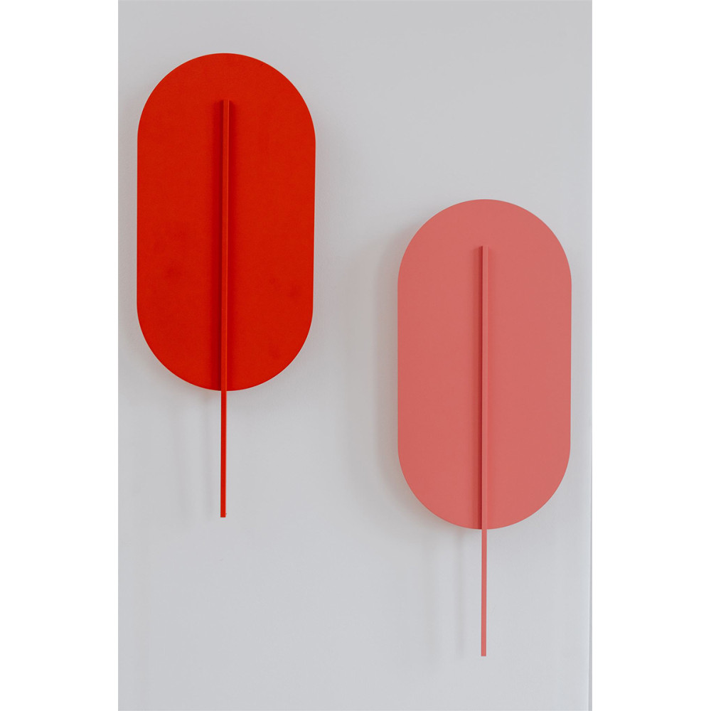 • wall lamp, sconce • colour red-orange (Vermilion RAL 2002) • material metal, brass • length 3.8cm • width 21cm • height 56.6cm • red-orange lampshade with decorative element (attached with magnets to the wall cover) • white metal cover 8x8cm • thread 2xG9 • max 2x12W • IP20