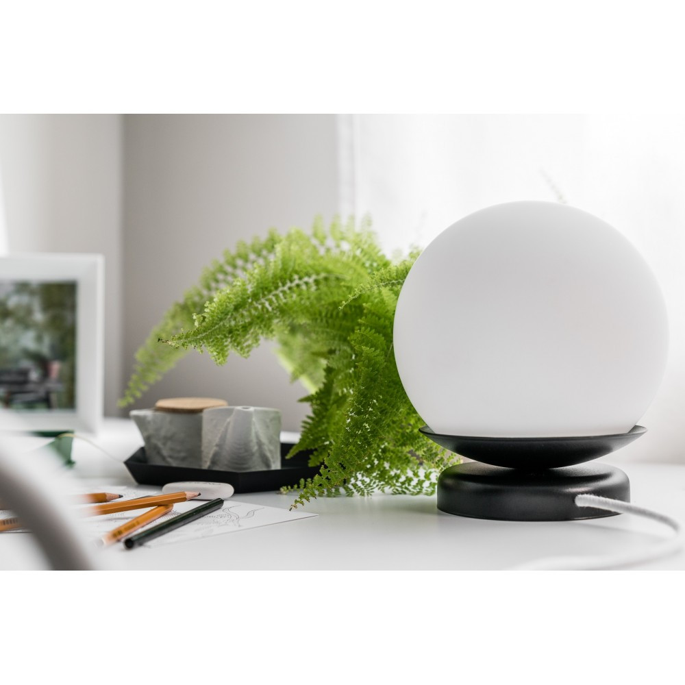 The lampshade comes to the fore - a classic 20 cm diameter glass sphere in a milky finish, resting on a low metal base. Thanks to its neat proportions, the lamp gains visual lightness, while remaining stable and practical.