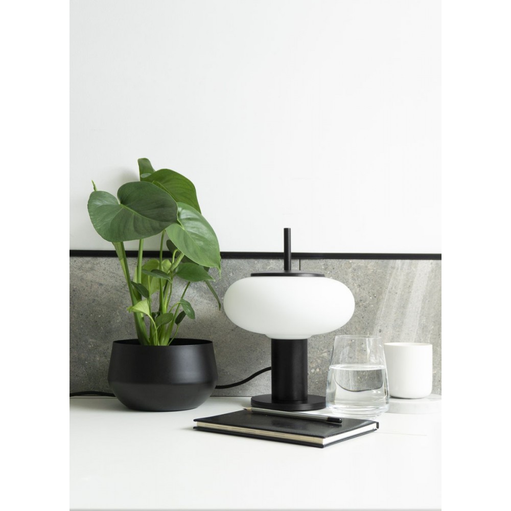 • table lamp • metal / glass • black / white • height 28.5cm • diameter 22cm • glass diffuser in white matt fi 22cm • lacquered black structural base fi 12cm • two-core cable 2 X 0.75mm2 in black polyester braid with 150cm long • black plug and switch • E27 thread • max. 15W
