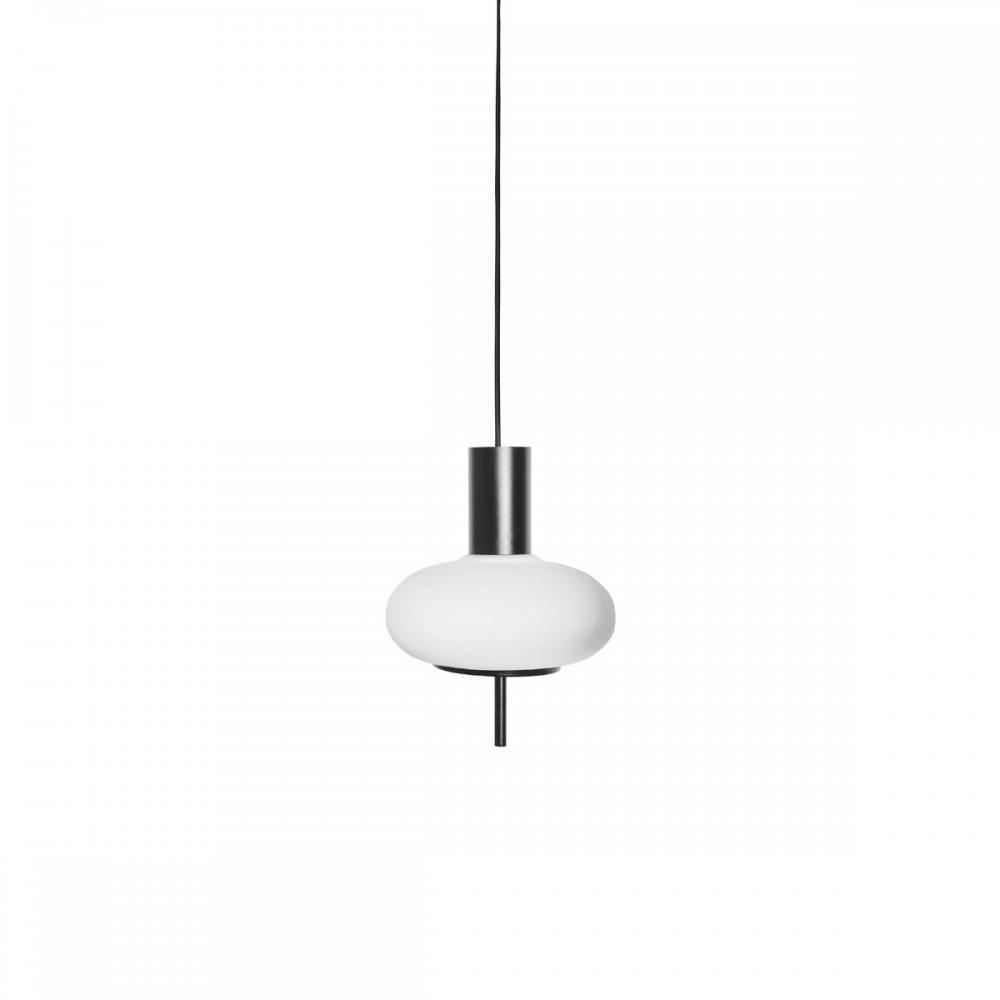 • ceiling lamp / pendant lamp • metal / glass • black / white • total length 130cm • diameter 22cm • glass diffuser in white matt fi 22cm • painted cover in black structural color fi 12cm • two-core cable 2 X 0.75mm2 in black polyester braid 100cm long • E27 thread • max. 15W